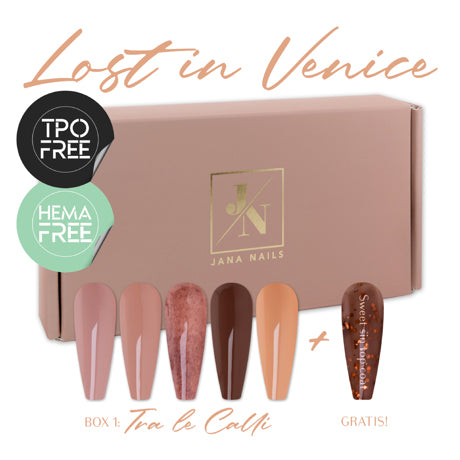 🤭 En parallèle, nous avons également créé un autre coffret, avec des tons automnaux plus froids, des effets spéciaux et un top coat noir semi-transparent : la Tra le Acque box. 😍🖤 Curieux(se) de découvrir le deuxième coffret Lost in Venice ? Cliquez ici ! – Tra le Acque box